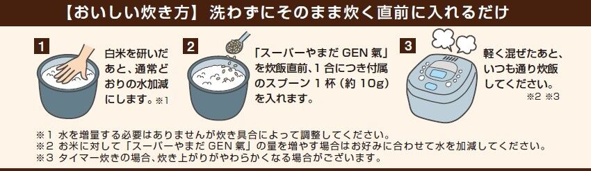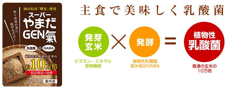 スーパーやまだGEN氣は発酵催芽玄米です。発芽直前の最もエネルギーの高い状態にある催芽玄米(岡山県産の曙米)を米麹とまぜ合わせ、適切な温度管理のもと、約2日間かけ発酵、乾燥させます。 本製品10gあたり、従来の玄米1トン分の植物性乳酸菌を含む、製法特許をもった「スーパー玄米」です。