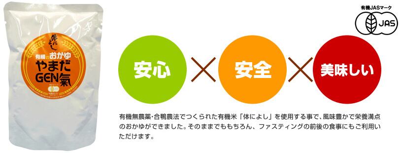 有機無農薬・合鴨農法でつくられた有機米「体によし」を使用する事で、風味豊かで栄養満点のおかゆができました。 そのままでももちろん。ファスティングの前後の食事にもご利用いただけます。「安心・安全・美味しい」三拍子そろったお粥です。